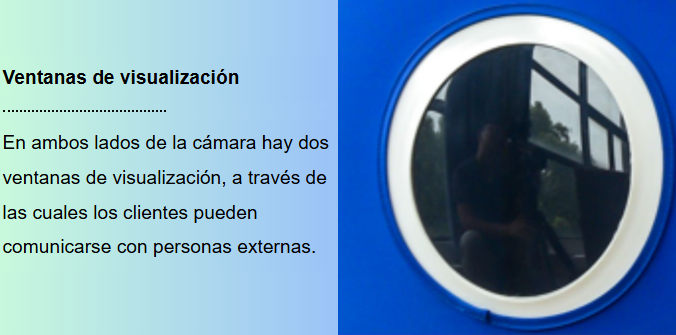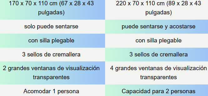 Portátil, fácil de transportar, instalar y operar. Dentro de la cámara se puede escuchar música, leer un libro, usar teléfonos celulares o computadoras portátiles.