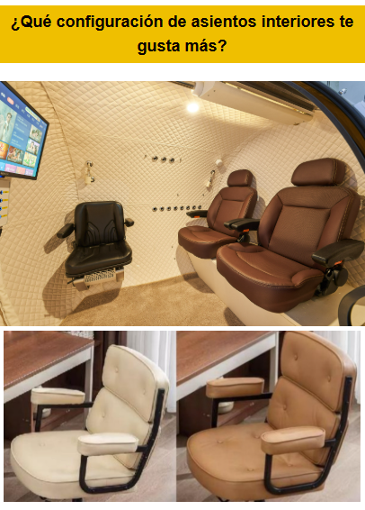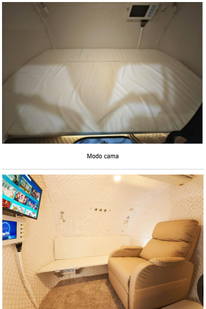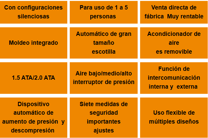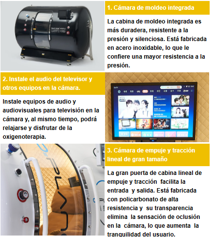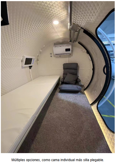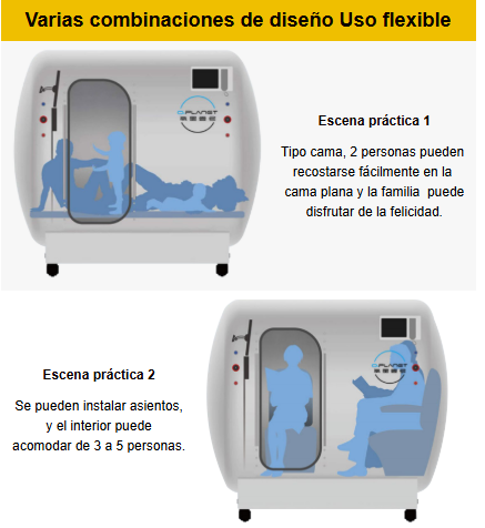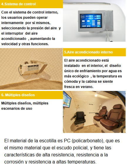 Construcción de una sola pieza para una mayor durabilidad. Sistemas de doble pantalla táctil, tanto interna como externa.3 tamaños para uso de 1 a 5 personas. Varios modos de uso que incluyen cama, bancos, asientos triples y sillones individuales. Permitir que varias personas respiren oxígeno simultáneamente con un sistema de aire acondicionado y ventilación.