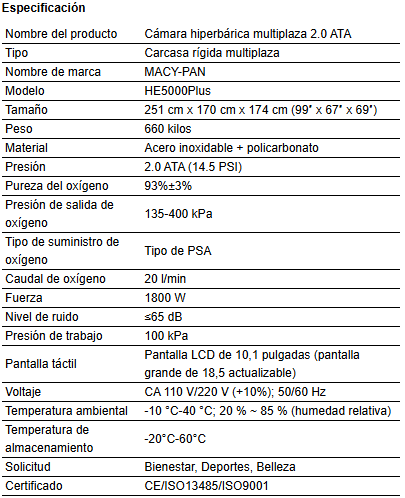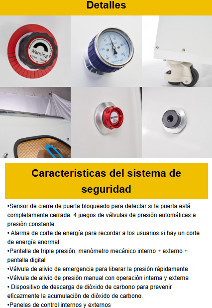 Presentamos nuestra cámara de presión de vanguardia, diseñada para un rendimiento óptimo y la máxima comodidad del usuario. Con un rango de presión de 1,5 ATA a 2 ATA, esta cámara garantiza seguridad y durabilidad mediante técnicas avanzadas de moldeo integrado.Características principales:Diseño que reduce el ruido: tanto el interior como el exterior están diseñados para minimizar el sonido, mejorando la experiencia general del usuario durante las sesiones.Sistema de control neumático: Nuestro innovador sistema de control neumático permite un funcionamiento suave y sin esfuerzo, garantizando fiabilidad y facilidad de uso.Mecanismo único de bloqueo de puerta corrediza: esta característica garantiza un acceso seguro y conveniente, lo que facilita entrar y salir de la cámara.Interior espacioso: Diseñado para alojar cómodamente hasta cinco adultos, ofrece amplio espacio para sesiones grupales o uso individual. Experimente la combinación perfecta de seguridad, comodidad y funcionalidad con nuestra avanzada cámara de presión.