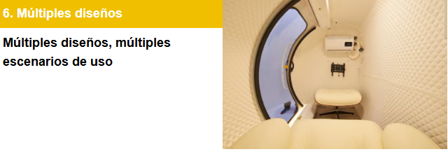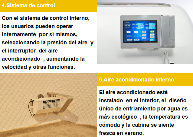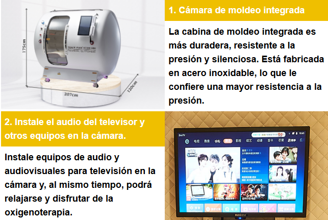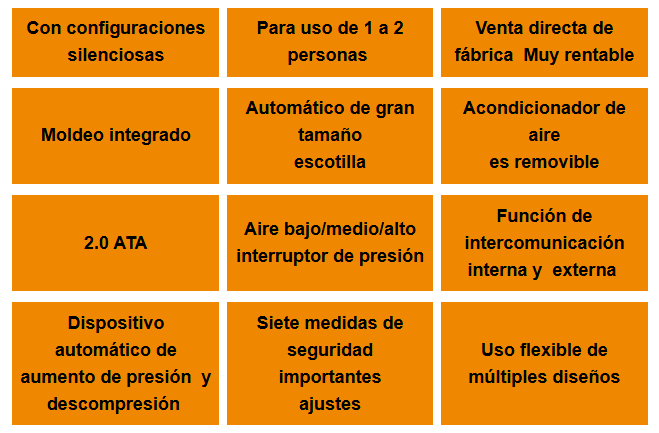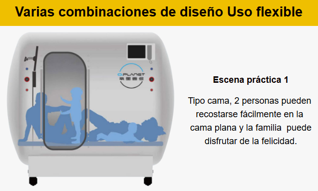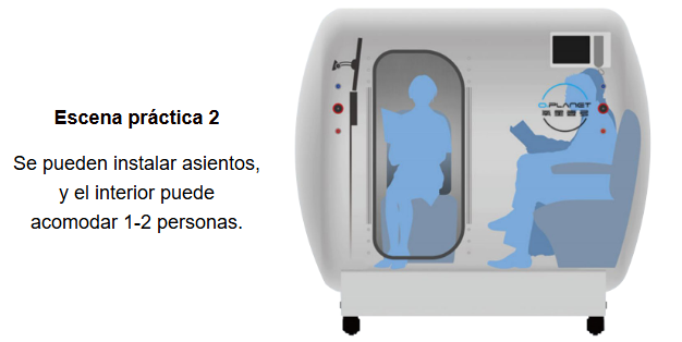 Construcción de una sola pieza para una mayor durabilidad. Sistemas de doble pantalla táctil, tanto interna como externa.3 tamaños para uso de 1 a 2 personas. Varios modos de uso que incluyen cama, bancos, asientos triples y sillones individuales. Permitir que varias personas respiren oxígeno simultáneamente con un sistema de aire acondicionado y ventilación.